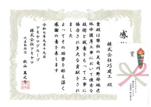 株式会社 アキヤマ 様 より感謝状を頂きました